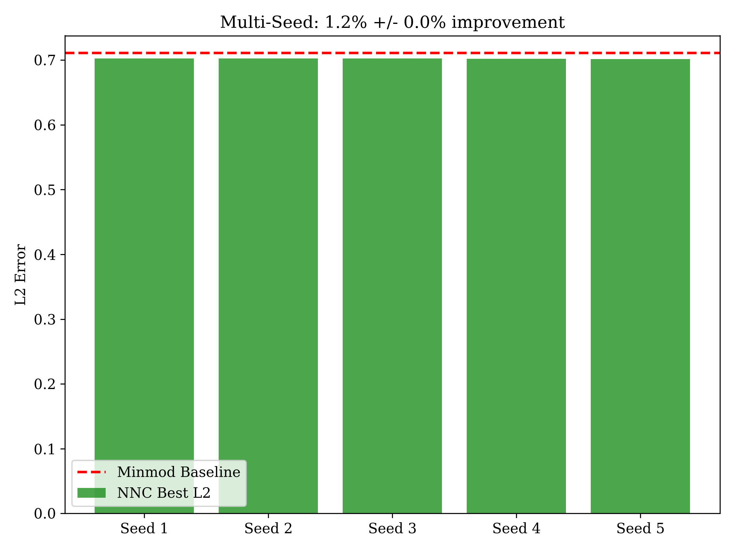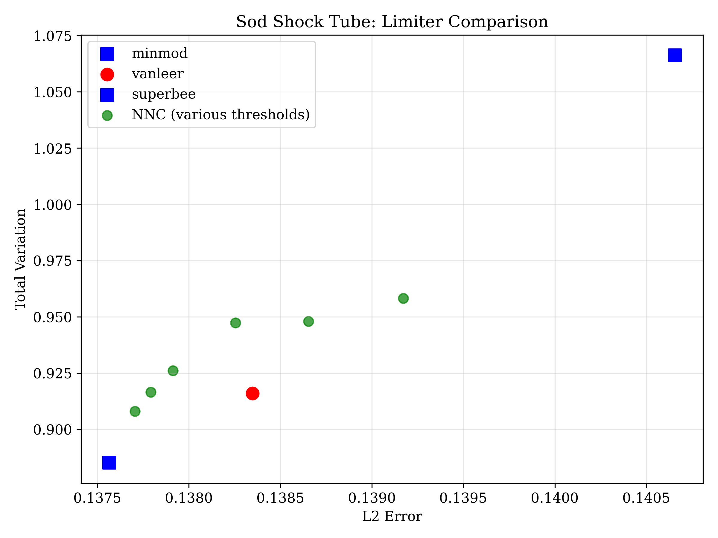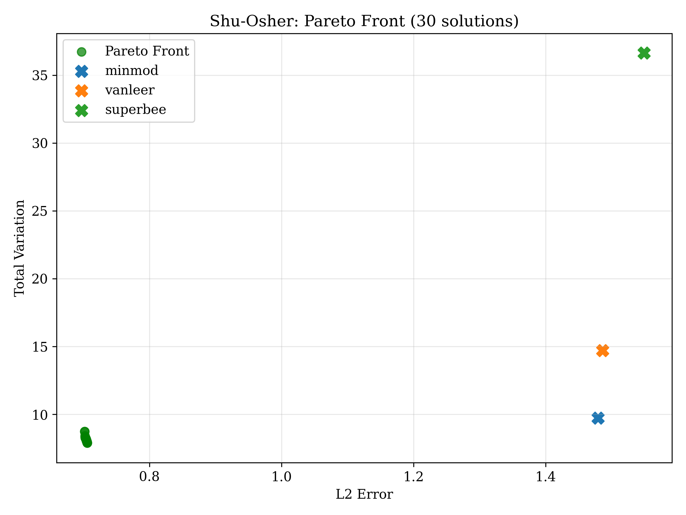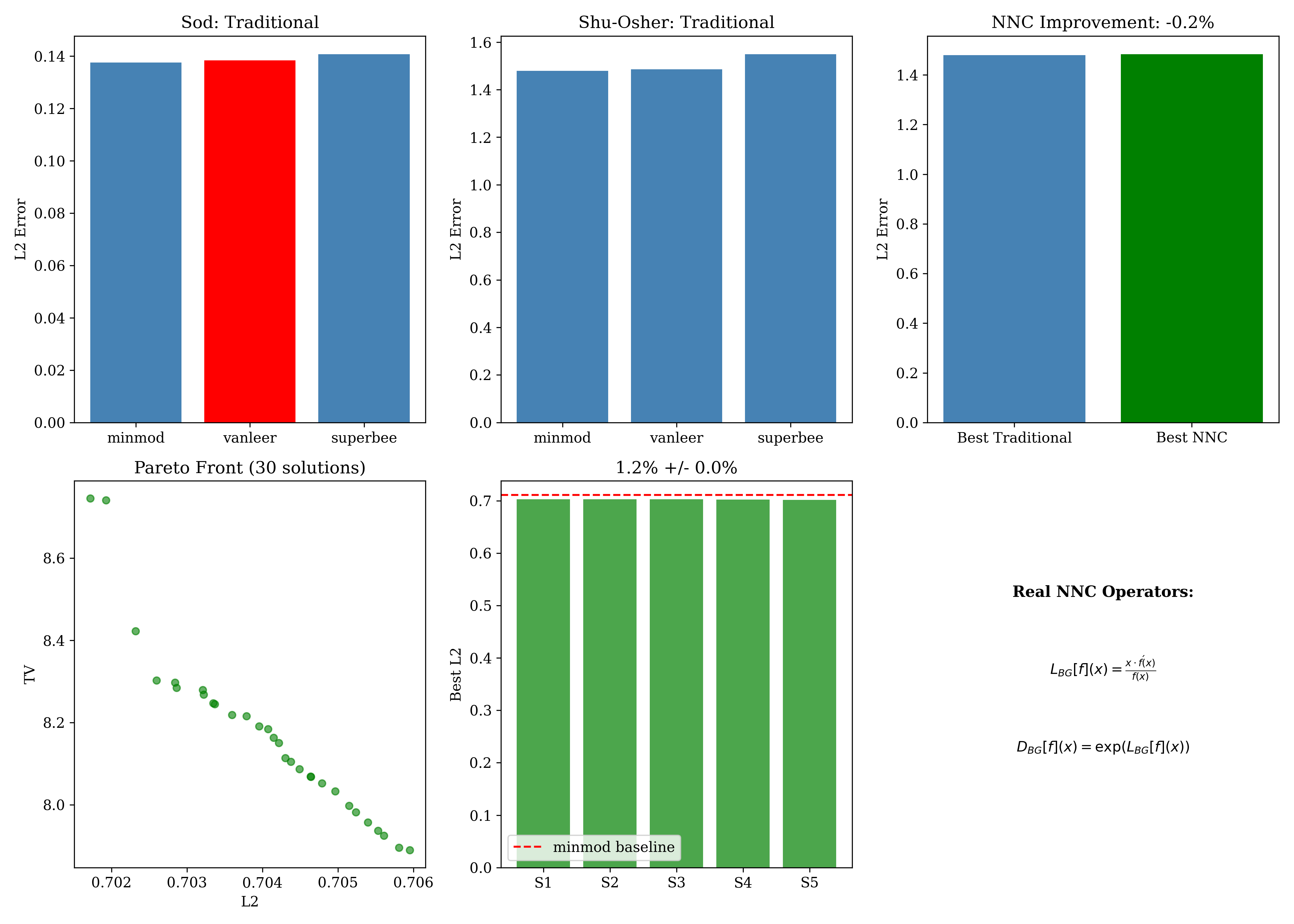 results/shock_tube_full_nnc.json- 30 Pareto solutions (real NNC)results/cross_validation_results.json- Transfer testsresults/mesh_refinement_results.json- Resolution studyresults/lax_shock_tube_results.json- 3rd benchmarkresults/multi_seed_moo_results.json- 5-seed stats