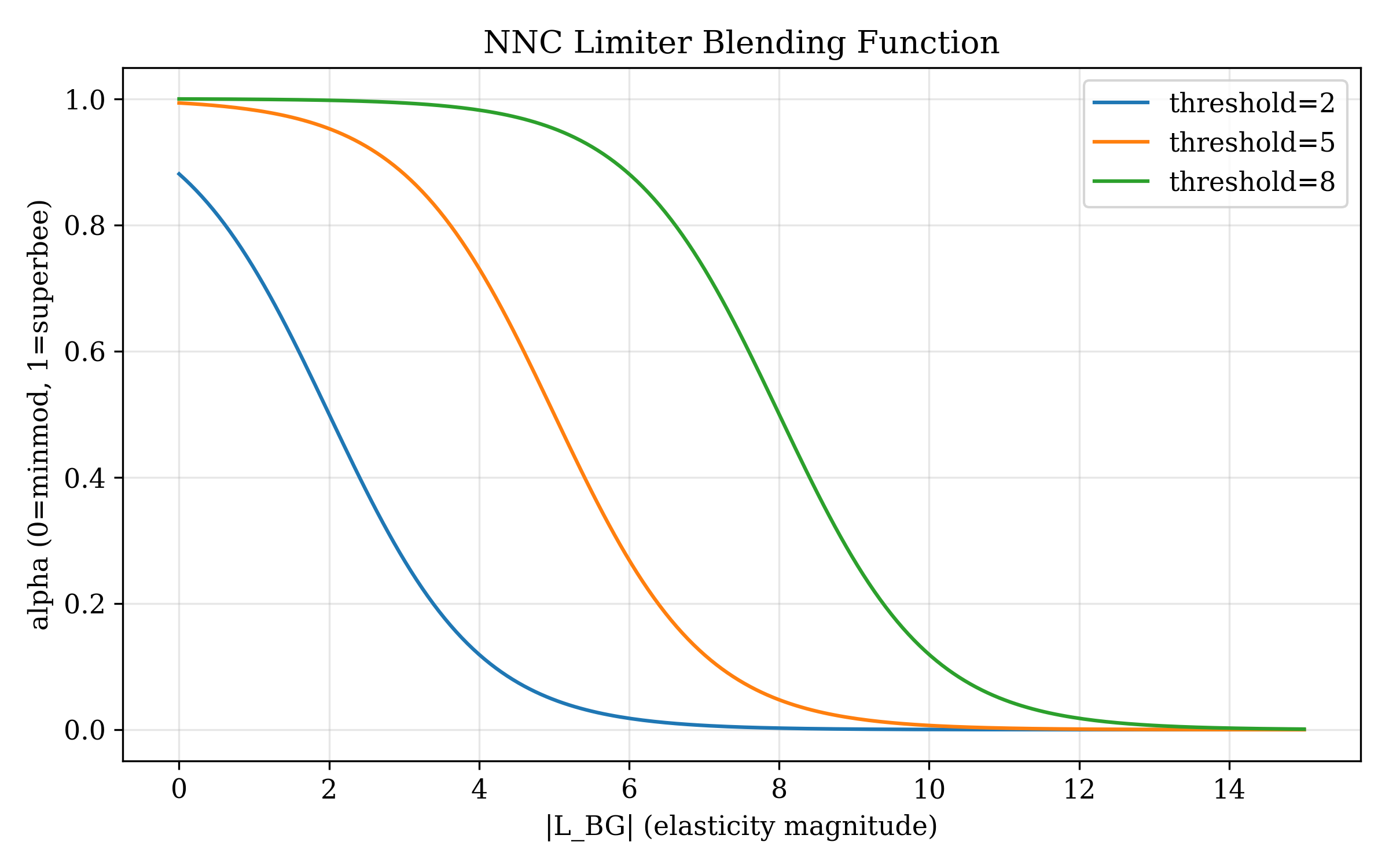 - - Low |L_BG| (smooth) --> superbee (compressive)