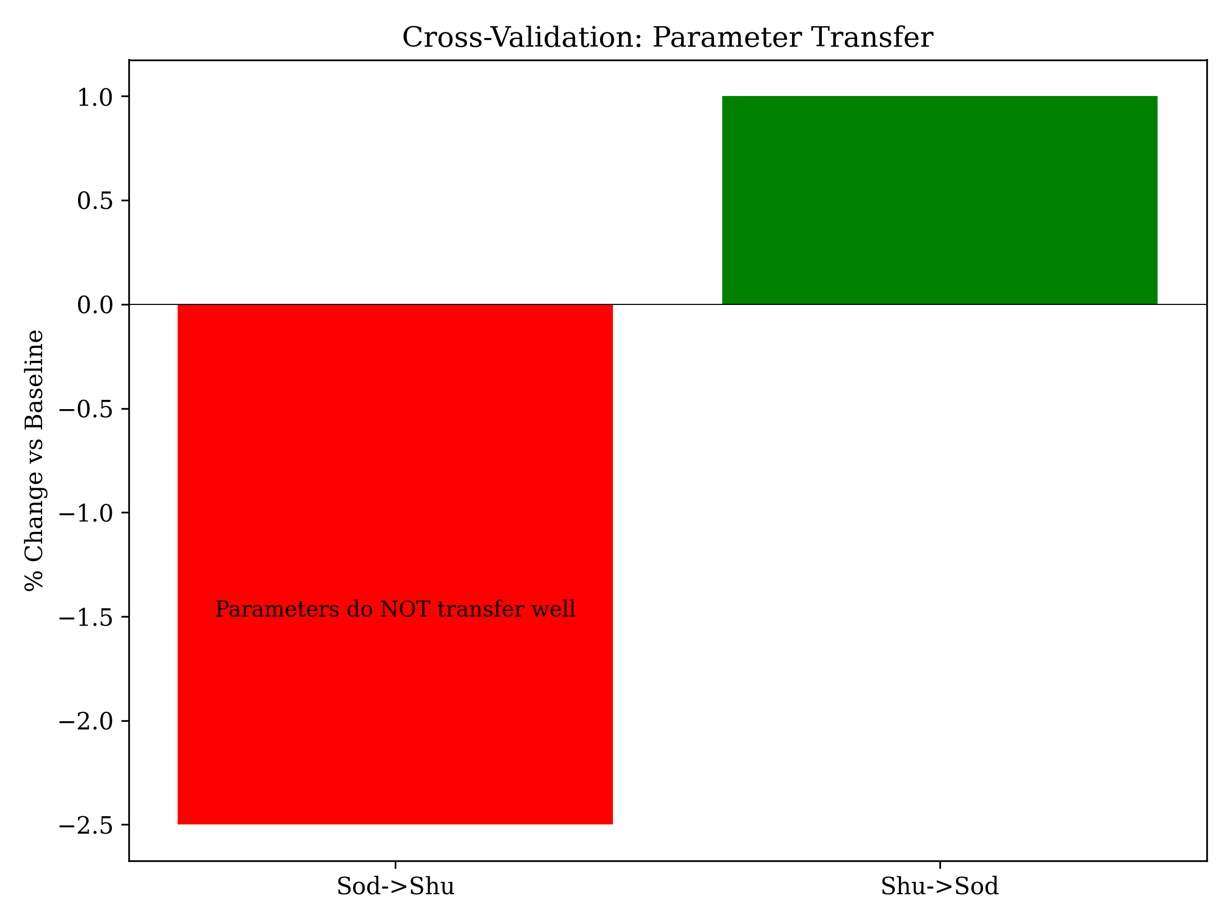 The optimal strategy ("be cautious, except at shocks") wasn't what experts expected. Systematic optimization found what humans missed.